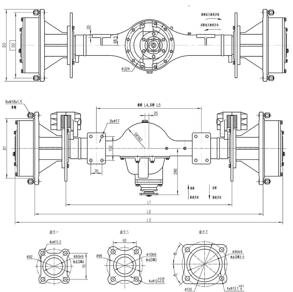 QWL10B QWL15F QWL15F(A) QWL16D QWL16E Main reducer ratio 5.833 5.833 5.833 5.833 5.833 Transmission ratio at wheel 3.23 3.9 3.23 4.4 4.4 Overall transmission ratio 18.84 22.75 18.84 25.665 25.665 Axle load 7500Kg 7500Kg 7500Kg 7500Kg 7500Kg Input torque 785N.m 785N.m 785N.m 785N.m 785N.m Brake Number of cylinder 2 2 2 2 2 Cylinder diameter Ф75mm Ф75mm Ф75mm Ф75mm Ф75mm Braking oil pressure 9.8MPa 9.8MPa 9.8MPa 9.8MPa 9.8MPa Braking radius R157 R167 R167 R162 R162 Brake moment 4070N.m 4300N.m 4300N.m 4300N.m 4300N.m