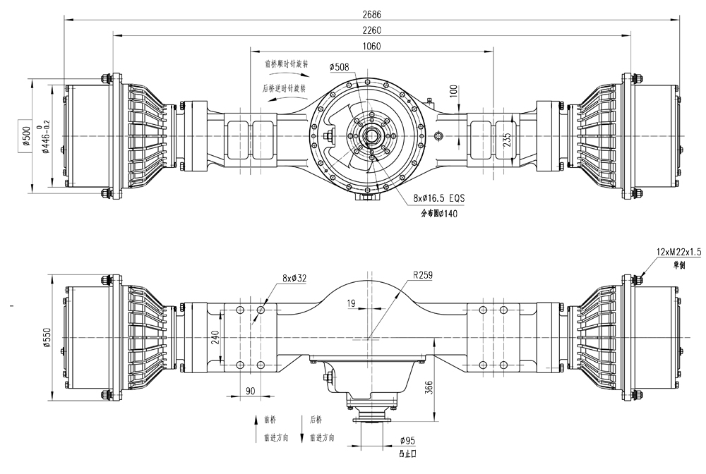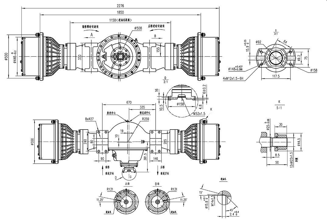 - Two-stage decelerating stucture is adopted for the drive axle.