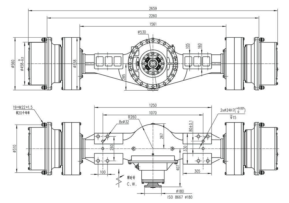 - Two-stage decelerating stucture is adopted for the drive axle.